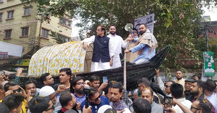 ঢাকা-৭ আসনের নির্বাচনী প্রচারণায় নৌকায় চড়েছেন আওয়ামী লীগ মনোনীত প্রার্থী সোলায়মান সেলিম ও তার বাবা সাবেক সংসদ সদস্য হাজী সেলিম।